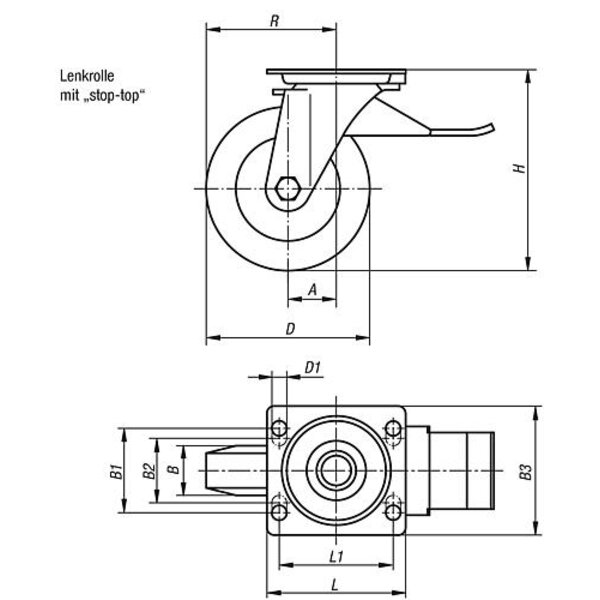 NORELEM Stahlblich-Lenkrolle m. STOP-TOP