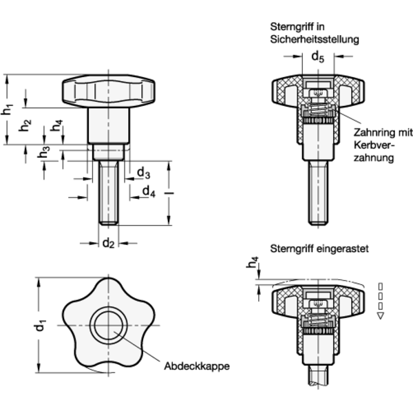 Erst durch axiales Drücken des Sterngriffes rasten die beiden Kerbverzahnungen ein, so daß gelöst oder gespannt werden kann.