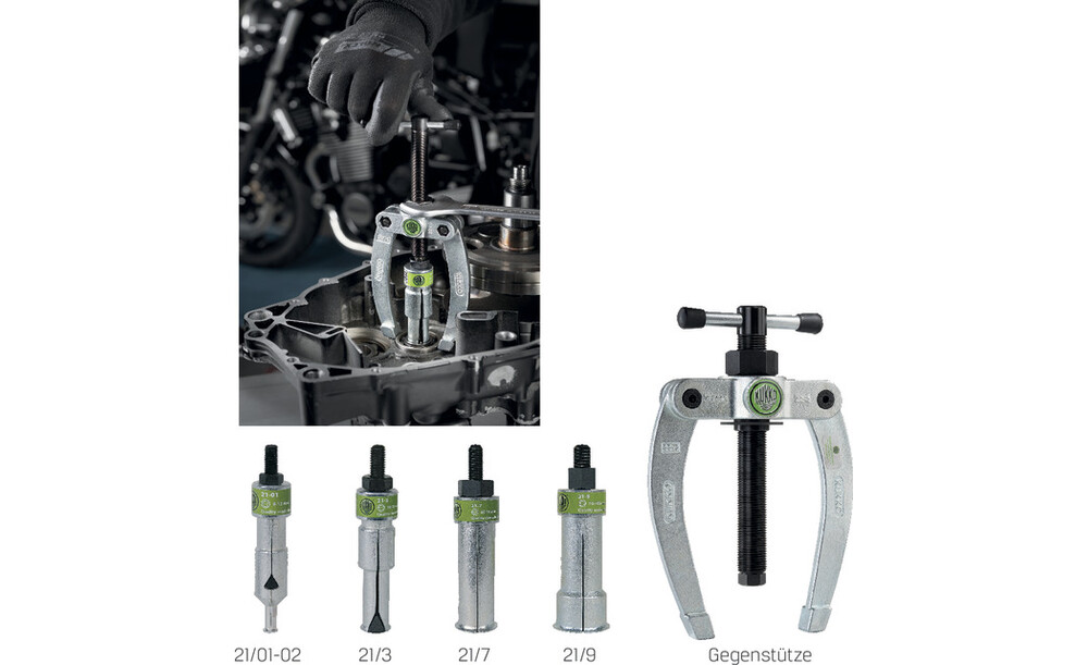 Zum Abziehen von Kugellagern, Kugellageraußenringen und Büchsen. Auch ganz dicht auf der Rückwand sitzende Lager werden durch die sehr gute Spannwirkung sicher erfasst und schnell ausgezogen.