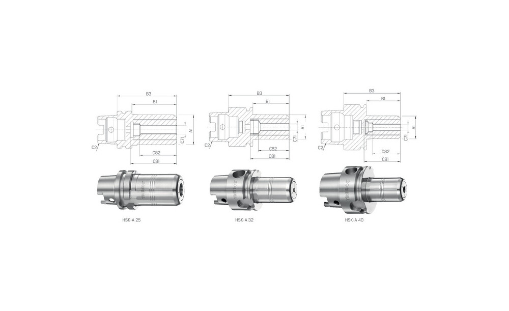 - für automatischen Werkzeugwechsel - ohne Längenverstellschraube - Werkzeugschaftqualität h6 - dauerhafter Rundlauf und Wechselwiederholgenauigkeit < 0,003 - HSK-A 32 / HSK-A 40 mit Gewinde für Kühlmittelrohranschluss - HSK-A 25 ohne Gewinde für Kühlmittelrohranschluss