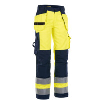 Damen High Vis Bundhose Gelb/Marineblau, 85% polyester, 15% cotton, satin, 300g/m², Gelb/Marineblau, Zwei lose, aus Cordura verstärkte Nageltaschen, die in die Vordertaschen mit Balg gesteckt werden können. Zwei Vordertaschen mit Balg unter den losen Nageltaschen. Zwei Gesäßtaschen. Beintasche mit Balg und Patte. Zollstocktasche. Kniepolstertaschen aus CORDURA®. Hammerschlaufe. Reflektoren. EN 20471 Kl. 2. Ausweistasche.