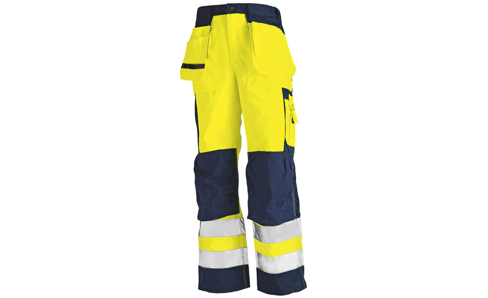 Zwei lose, mit Cordura verstärkte Nageltaschen, die in die Vordertaschen mit Balg verstaut werden können. Zwei Gesäßtaschen, eine davon mit Balg. Beintasche mit Balg und Patte. Zollstocktasche. Kniepolstertaschen aus CORDURA®. Hammerschlaufe. Schlüsselring. Ausweistasche. 65 mm breite Reflektoren. Zertifiziert nach EN 471 / EN 20471. Größe C44 entspricht Klasse 1, C46 und größer entspricht Klasse 2.