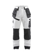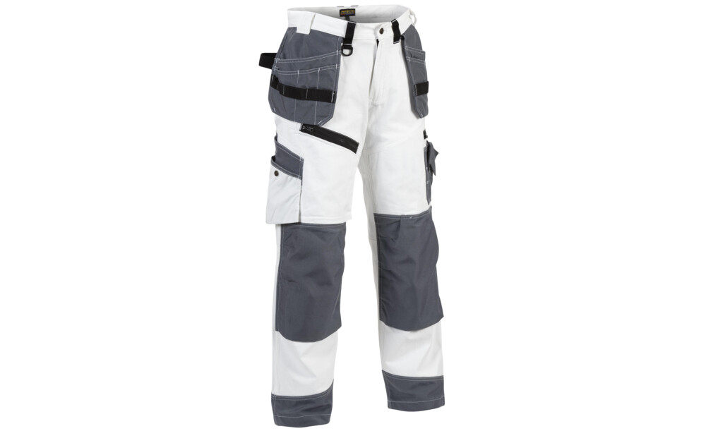 Zwei verstärkte Nageltaschen aus CORDURA®, die in den Vordertaschen verstaut werden können. Schraubendreherschlaufe. Zwei Gesäßtaschen mit Balg. Hammerschlaufe. Hosenschlitz mit solidem Metallreißverschlus. Verstärkte Zollstocktasche mit Stiftefach und Messerhalter. Beintaschen mit Handytasche aus wasserabweisendem Material. In zwei Größen einsetzbare Kniepolstertaschen aus CORDURA®. Ausweistasche, die in die Beintasche gesteckt werden kann. Schlüsselschlaufe. Hosensaum mit Zugband verstellbar.