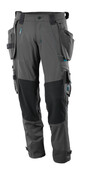 Hat ein wasserabweisendes Finish. Vier-Wege-Stretchstoff mit geringem Gewicht und hoher Strapazierfähigkeit. Der Stoff ist fast nicht auf der Haut zu spüren, da die Taschen im Design integriert sind. Zweifache Kappnähte an den Beinen und im Schritt. Niedrige Taille. Hosenbeine sind ergonomisch geformt. Gürtelschlaufen. Hosenschlitz mit Reißverschluss. Abnehmbare Hängetaschen aus strapazierfähigem CORDURA®-Gewebe - das Vorderteil der rechten Hängetasche hat Verstärkungen aus durchstichfestem Kevlar® im Boden. Vordertaschen.Gesäßtaschen. Werkzeugschlaufen an beiden Seiten des Bundes. Schenkeltasche mit Handytasche mit Magnetverschluss und integriertem ID-Kartenhalter. ID-Kartenhalter ist abnehmbar. Zollstocktasche aus CORDURA® Gewebe mit extra Taschen. Strapazierfähige und durchstichfeste Knietaschen aus CORDURA®/Kevlar®/Dyneema® sind elastisch und mit Ventilation. Druckknopfregulierung an den Fußgelenken. Reflexeffekte. Wir empfehlen den MASCOT® Waterloo, MASCOT® Likasi und 20118-915 Knieschutz zu diesem Modell.