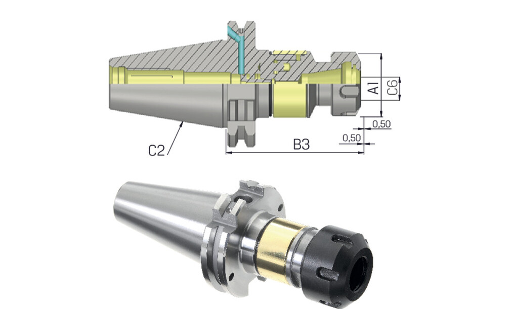 - sicheres Spannen der Gewindebohrer mit Spannzangen DIN ISO 15488 (ER) und Innenvierkant- oder Gewindebohrer