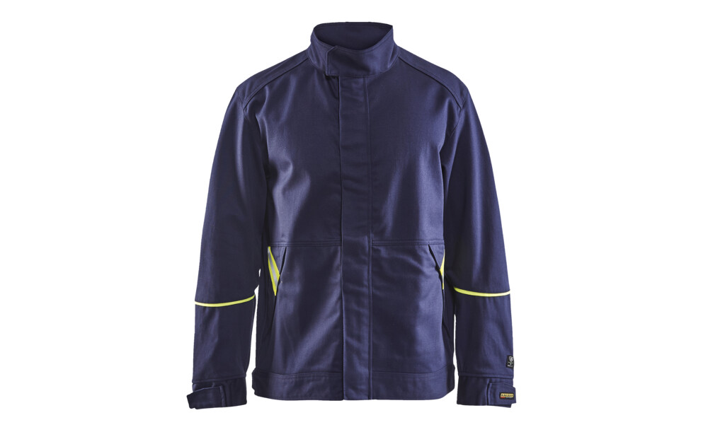 Schweißer Jacke mit Reflexdetails für höhere Sichtbarkeit. Komfortabler Schnitt mit vorgeformten Ellbögen und einstellbarem Armabschluss mit Klettverschluss. Zertifiziert nach EN 1149-5. EN ISO 11611 Klasse 2 , A1+A2, EN ISO 11612 A1, A2, B1, C1, E3, F1. IEC 61482-2. Stoff 79% Baumwolle, 20% Polyester, 1% andere Fasern, Satin, flammhemmend antistatisch 450g/m² Wäsche Industriewäsche, EN ISO 15797 Funktionalität Vorgeformte Ärmel Details Etikett außen Einstellbare Breite des Kragens, Hoher Kragen Frontverschluss Versteckter Ein-Wege-Reißverschluss aus Metall Taschen Vordertaschen mit Patten Abschluss Verstellbarer Bund mit Klettverschluss Verstellbare Ärmelbündchen mit Klettverschluss Reflex Reflektierende Details