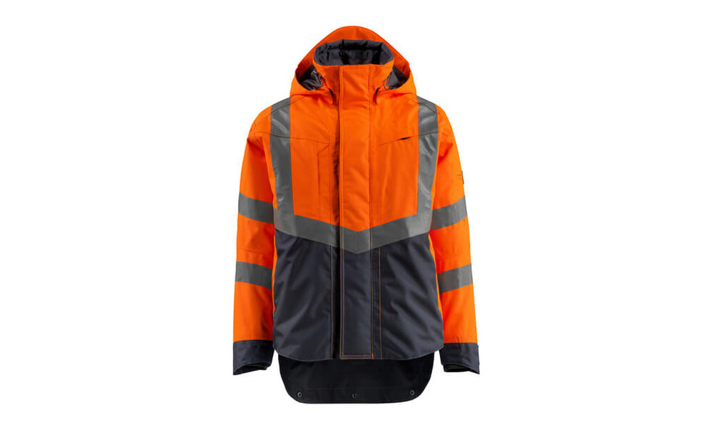 Fluoreszierend und mit Reflexschulterstreifen sowie schrägverlaufenden Reflexen. Zweifarbig. Atmungsaktiv, wind- und wasserdicht. Nähte sind verklebt. Futter aus Netzmaterial. Kapuze, abnehmbar, gefüttert und mit Elastikschnüren regulierbar, so dass diese über einen Helm passt. Regulierbarer Draht an beiden Seiten der Kapuze. Netzventilation mit Reißverschluss unter den Ärmeln. Stehkragen. Innenkragen aus Strick. Wasserdichte Stifttasche am Ärmel. Verschluss mit Reißverschluss und Wetterschutzleiste mit Druckknöpfen. Reißverschlussinnentaschen unter der Wetterschutzleiste – die eine speziell für Handys entwickelt, mit Öffnung sowie Schlaufen für das Kopfhörerkabel. Tasche mit Reißverschluss unter der Wetterschutzleiste, mit Platz für ein 7 Zoll Tablet. Verlängerter Rücken durch herunter knöpfbaren Stoff zum besseren Schutz vor Wind und Wetter. Brusttasche mit Reißverschluss. D-Ring. Ergonomisch geschnittene Ärmel ermöglichen hohe Bewegungsfreiheit. Rippenbündchen an den Handgelenken schließen gut ab und halten die Kälte draußen. Manschettenmit Verstärkungen aus CORDURA®-Gewebe und Druckknopfverschluss. Vordertaschen mit Reißverschluss. Hi-Vis Gruppe A. Zertifiziert nach EN ISO 20471 - Kl. 3 und EN 343 - Kl. 3/3. Das Produkt ist zertifiziert, dass dieses mit einem Logo von 0,0400 m² versehen werdendarf. Dieses zulässige Areal darf nicht überschritten werden. Das Logo auf der Vorder- und Rückseite darf jeweils maximal 50% des gesamten Logoareals betragen, um die Zertifizierung gemäß EN ISO 20471 beizubehalten.