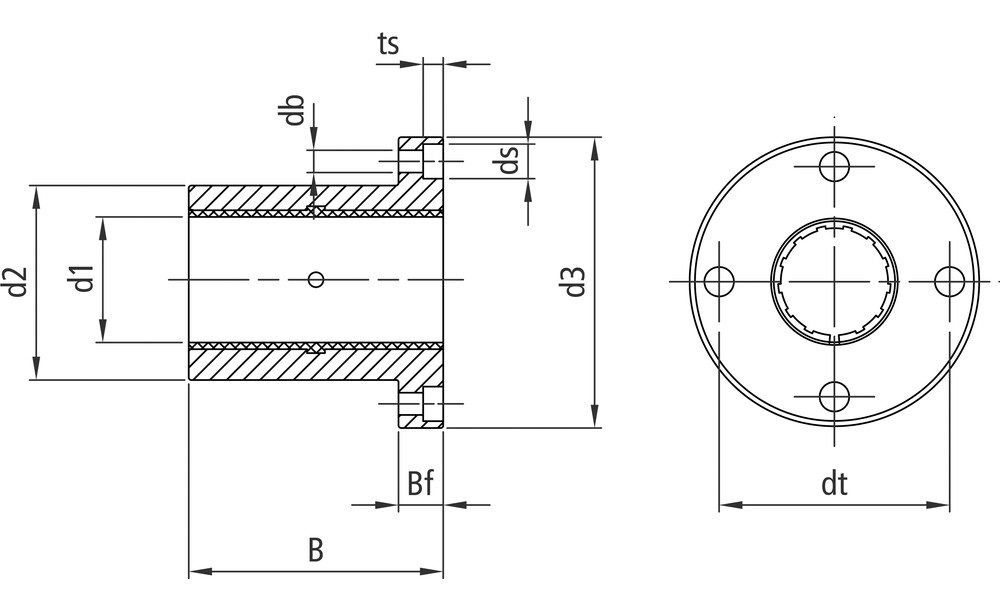 Zu den VariantenDie Flanscheinheit besteht aus einer austauschbaren Gleitfolie und einem anodisierten Aluminiumgehäuse. Als wichtige Merkmale zur Größenbestimmung ist der Innendurchmesser d1 sowie das Lochbildmaß dt zu nennen. Bei dieser Gehäuseausführung handelt es sich um den runden Flansch, eine weitere Variante mit eckigem Flansch ist ebenfalls erhältlich.