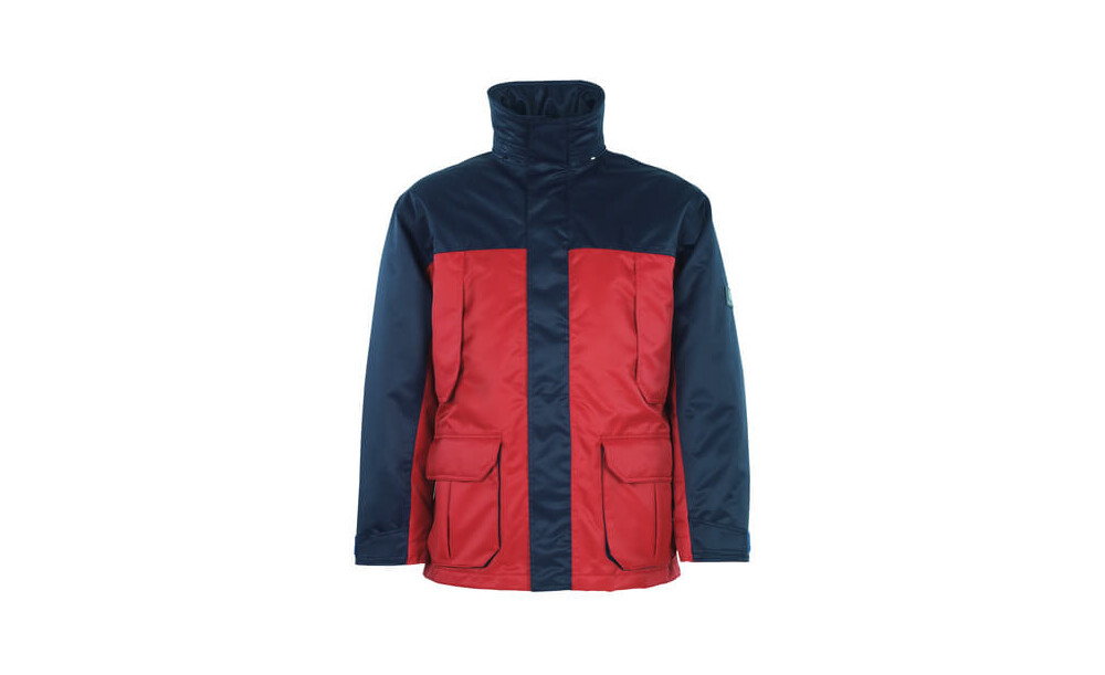 Zweifarbig. Atmungsaktiv, wind- und wasserdicht. Nähte sind verklebt. Futter aus Stepp mit Reißverschluss herausnehmbar. Verschlussmit Zwei-Wege-Reißverschluss, doppelter Wetterschutzleiste und verdeckten Druckknöpfen. Reißverschlusstasche unter der Wetterschutzleiste. Brusttaschen mit Reißverschluss. D-Ring. Harmonikataschen mit Patte und extra Taschen. Rippenbündchen (verdeckt unter der Wetterschutzleiste) und Klettverschluss an den Handgelenken. Gummizug in der Unterkante, regulierbar. Zertifiziert nach EN 343 - Kl. 3