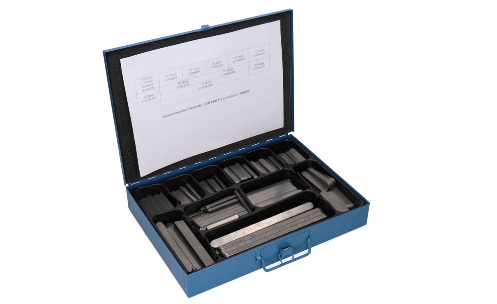 Zu den VariantenPassfedern Sortiment DIN 6885 Form A Werkstoff C45 +C in den 12 gängigsten Abmessungen.