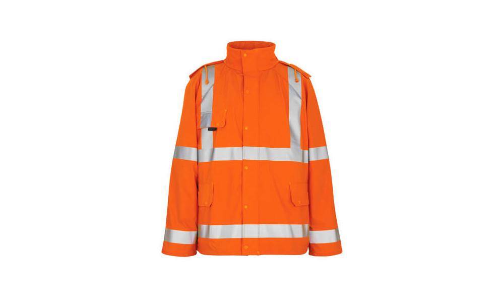 Wind- und wasserdicht. Fluoreszierend, mit Reflexschulterstreifen und waagerechten Reflexen. Nähte sind verschweißt. Kapuze mit im Kragen verdeckten Schnüren. Verschluss mit Reißverschluss und Wetterschutzleiste mit Druckknöpfen. Brusttasche mit Patte und Druckknopf. Vordertaschen mit Patte und Druckknopfverschluss. Ventilation im Rücken. Gummizug in der Unterkante, regulierbar. Druckknopfregulierung an den Handgelenken. Hi-Vis Gruppe A. Zertifiziert nach EN ISO 20471 - Kl. 3 und EN 343 - Kl. 3/1. Das Produkt ist zertifiziert, dass dieses mit einem Logo von 0,4100 m² versehen werden darf. Dieses zulässige Areal darf nicht überschritten werden. Das Logo auf der Vorder- und Rückseite darf jeweils maximal 50% des gesamten Logoareals betragen, um die Zertifizierung gemäß EN ISO 20471beizubehalten.