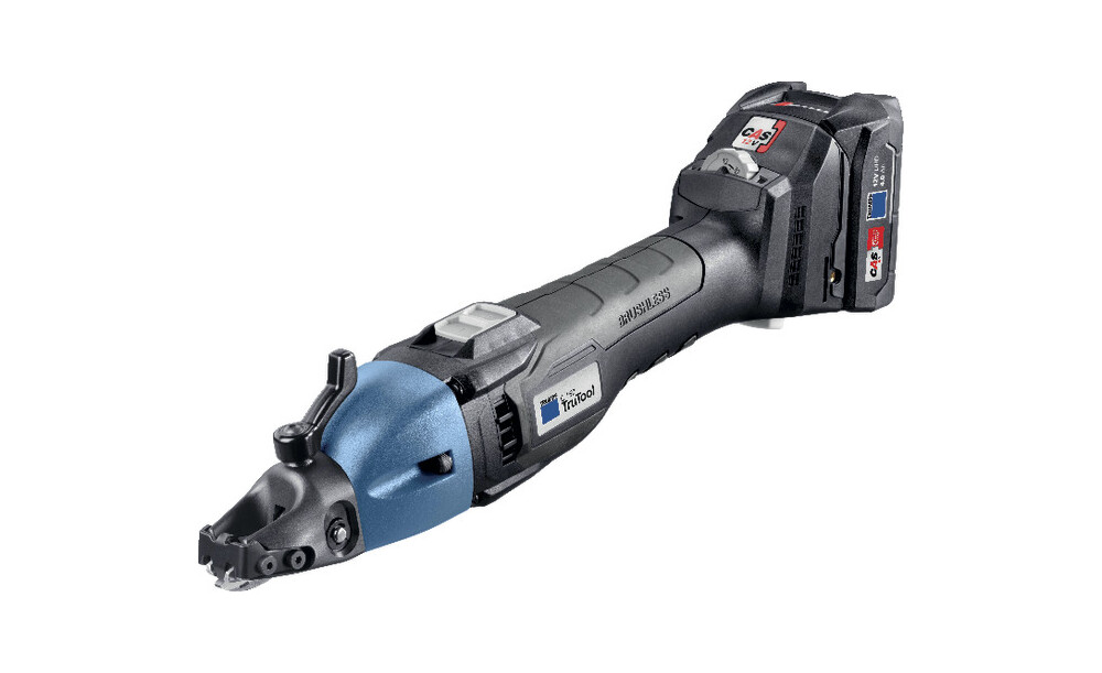 2 Li-Ion Akkus, Ladegerät, Messer gerade 1-1,6 mm (eingebaut), Schneidleistensatz (eingebaut), Sechskantstiftschlüssel und Spanabtrenner (eingebaut), in TRUMPF Box S2.