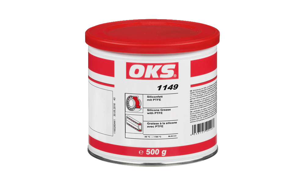 OKS 1149 ist ein Silikonfett mit PTFE für die Langzeitschmierung von Kunststoff-/Kunststoff-, Kunststoff-/Metall-, und Elastomer-/Metall-Paarungen unter geringen bis mittleren Lagerbelastungen und Geschwindigkeiten.