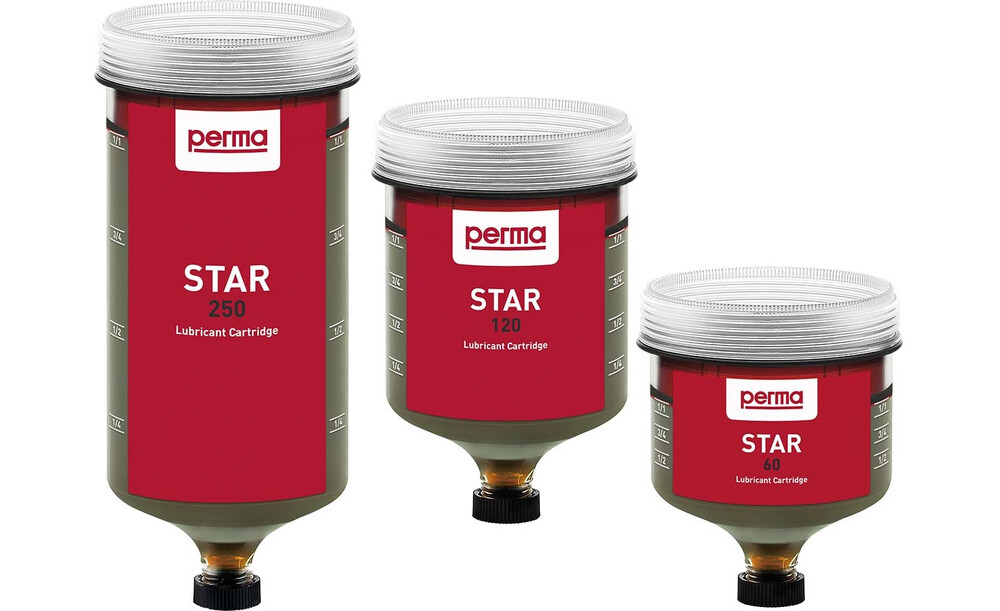 perma STAR VARIO arbeitet vollautomatisch, temperatur- und druckunabhängig und verfügt über ein äußerst präzises Spendeverhalten. Das System besteht aus einem elektromechanischen Antrieb, einer LC mit 60 cm³, 120 cm³ oder 250 cm³ Schmierstoff und einem Batterieset. Die gewünschte Spendezeit und LC-Größe wird einfach mit dem Einstelltaster  gewählt und ist sofort im LCD-Display sichtbar. Der aktuelle Betriebszustand wird durch rundum sichtbare LED-Sognale (rot/grün) sowie auf dem LCD-Display angezeigt. Die LED-Sigale sind auch aus der Distanz erkennbar.