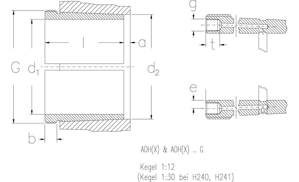 Bei Abziehhülsen beginnt die Bezeichnung mit AH oder AHX. Das X deutet auf einen Änderungsindex der DIN hin, der heute Standard geworden ist. Bei Abziehhülsen mit Ölbohrungen und -kanälen lautet die Bezeichnung AOH oder AOHX. Abziehhülsen mit der Bezeichnung AOH und AOHX haben immer Ölkanäle in der Bohrung und auf dem Kegel.