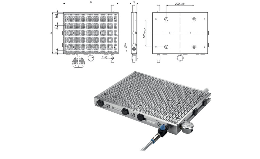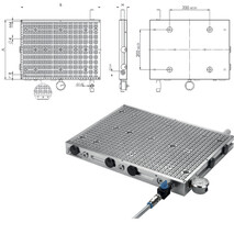 - durch seitliche Nuten oder die Befestigungsbohrungen (für M8) kann die Vakuumspannplatte auf einer Grundplatte (z. B. Maschinentisch) befestigt werden
