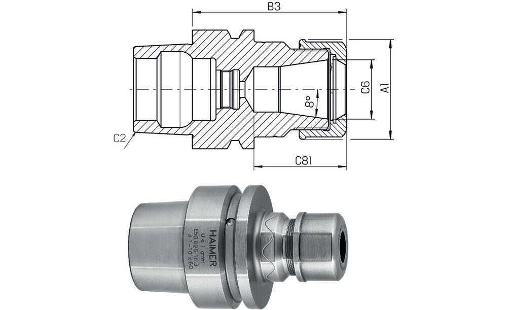 - auch für Standard-Spannzangen ER nach ISO 15488 (Achtung: Bei Verwendung mit Standard-Spannzangen wird das B3-Maß länger)