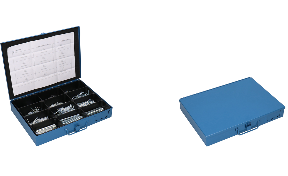 Zu den VariantenSplinte Sortiment DIN 94 mit den 12 gängigsten Abmessungen von 1 x 20 - 8 x 80, ca. 910 Stück im Metall-Koffer.