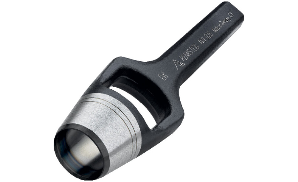 aus Werkzeugstahl, kräftige, geschmiedete Form, mit blanker Pfeife, innen und außen leicht konisch, schwarz tauchlackiert