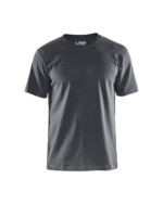 Rundhalsausschnitt mit Gewebeband. Formstabil. Graues T-Shirt ist hellgrau-meliert.