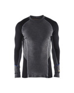 Zweifarbiges, körperbetontes Unterwäsche-Oberteil in Merino-Wolle. Rollkragen. Wärmende Einsätze an den Schultern, den oberen Ärmeln und an den Seiten. Verlängerter Rücken hält den Rücken und die Nieren angenehm warm. Details in Kontrastfarben. "Merino by Blakläder"- Aufdruck auf der rechten Schulter-Seite. Gedruckte Größenangabe für den besten Tragekomfort.
