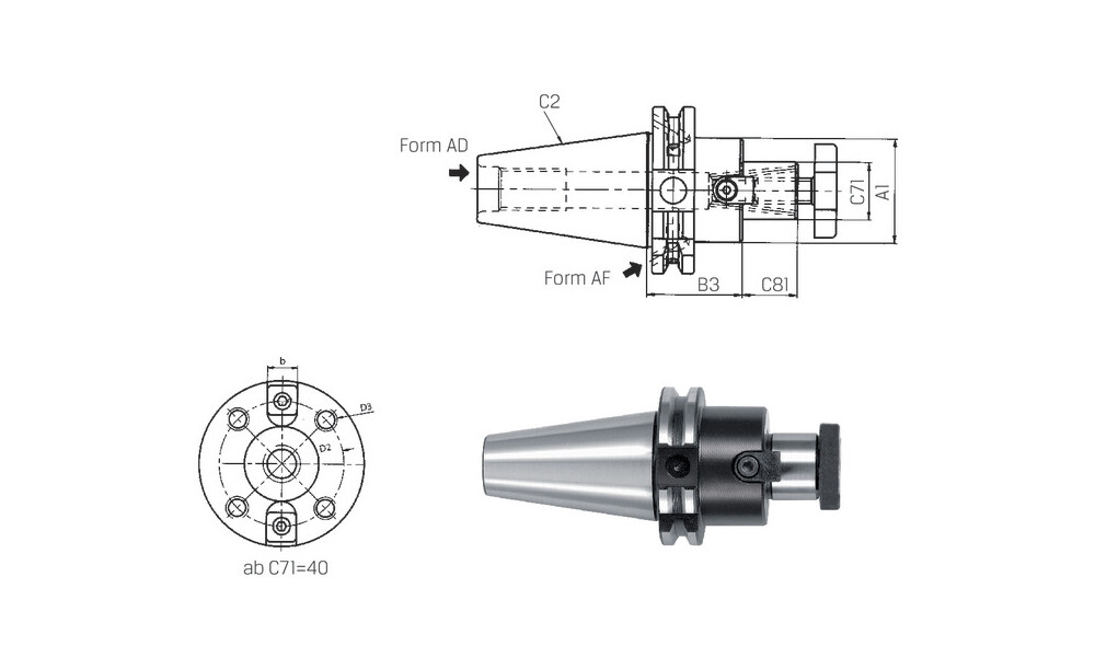 Ab C71 = 40 mm zusätzlich mit 4 Gewindebohrungen nach DIN 2079.