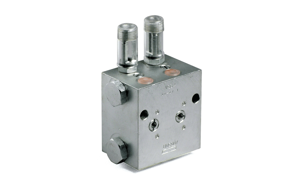 Zweileitungs-Schmierstoffverteiler Die robusten VSG Schmierstoffverteiler aus verzinktem Stahl sind für Zweileitungssysteme mit einem Druck bis 400 bar (5 800 psi) ausgelegt. Diese Schmierstoffverteiler sind mit bis zu acht Auslässen verfügbar, wobei jedes Auslasspaar mit einem Anzeigestift zur visuellen Überwachung ausgestattet ist. Die VSG Schmierstoffverteiler sind zudem mit verschleißarmen Näherungsschaltern oder Kolbendetektoren zur elektrischen Überwachung verfügbar (außer Ausführung VSG-D). Zusätzliches Merkmal ist die Verwendung rostbeständiger oder rost- und säurebeständiger Materialien. Einfache Zusammenführung von Auslassmengen eines Auslasspaares unter Verwendung des arretierbaren Drehschiebers. Solide Blockbauweise für lange Haltbarkeit und fehlerfreien Austausch In großem Temperaturbereich effizient einsetzbar Einfach zu überwachen