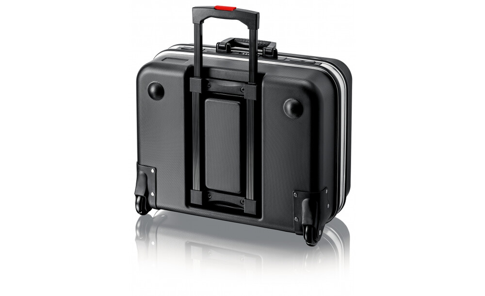 - Ausführungstrapazierfähige Ausführung aus ABS-Material, mit umlaufendem Aluminiumrahmen, stabilen, ergonomischen Tragegriff, zwei herausnehmbare Werkzeugtafeln aus schmutzabweisenden PP, Hohlkammerplatten mit 21 bestückbaren Werkzeugtaschen, Metall-Kippschlösser und dreistelligem Zahlencodeschloss, ausziehbarer Teleskopgriff sowie zwei leicht laufende Skater-Rollen