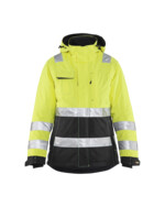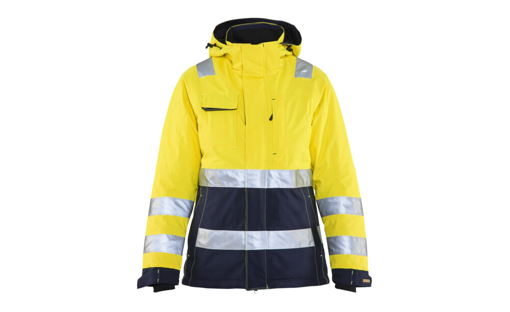 Warme Warnschutz-Winterjacke, speziell für Damen geschnitten. Die Jacke hat ein Steppfutter und ein robustes, wind- und wasserdichtes Außenmaterial mit verschweißten Nähten. Ebenso schützen dunkle Kontrastbereiche die Jacke vor zu großer Verschmutzung. Die Bewegungsfreiheit wird durch einen Zwei-Wege-Reißverschluss, vorgeformte Arme und einen verlängerten Rücken erhöht. 50 mm breite Reflexstreifen sorgen für Sichtbarkeit. Zertifiziert nach EN 342, EN 343, Klasse 3,1, EN ISO 20471, Klasse 2.