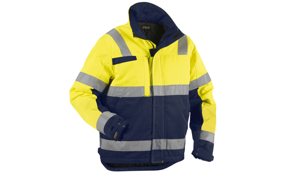 Wasser- und schmutzabweisendes Obermaterial. Zwei Front- und eine Brusttasche, mit Reißverschlüssen. Stiftetasche. Einziehbare Ausweistasche. Verstellbare Bündchen und Saum. Eine Innentasche. 50 mm breite Reflexstreifen. Zertfiziert nach EN 471, Warnschutzkleidung. S-L Klasse 2, XL-4XL Klasse 3, EN 342 zertifiziert, Schutz gegen Kälte.