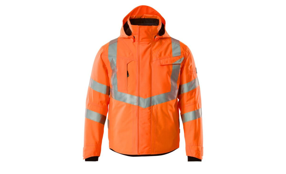 Fluoreszierend und mit Reflexschulterstreifen sowie schräg verlaufenden Reflexen. Atmungsaktiv, wind- und wasserdicht. Nähte sind verklebt. Mit CLIMASCOT® Lightweight Insulation. Wattiert. Futter aus Stepp in den Ärmeln. Stehkragen. Innenkragen aus Strick. Kapuze, abnehmbar, gefüttert und mit Elastikschnüren regulierbar, so dass diese über einen Helm passt. Regulierbare Stabilisierung an beiden Seiten der Kapuze. Verschluss mit Reißverschluss und Wetterschutzleiste mit Druckknöpfen. Reißverschlussinnentaschen unter der Wetterschutzleiste – die eine speziell für Handys entwickelt, mit Öffnung sowie Schlaufen für das Kopfhörerkabel. Tasche mit Reißverschluss unter der Wetterschutzleiste, mit Platz für ein 9,4 Zoll Tablet. Brusttasche mit Reißverschluss. Brusttasche mit Patte und Druckknopf. D-Ring. Ergonomisch geschnittene Ärmel ermöglichen hohe Bewegungsfreiheit. Vordertaschen mit Reißverschluss. Innen verstellbares Zugband in Hüfthöhe. Reißverschluss im Futter am Rücken zum Anbringen eines Logos/einer Stickerei. Rücken ist verlängert. Wasserdichte Stifttasche. Rippenbündchen (verdeckt unter der Wetterschutzleiste) an den Handgelenken. Manschetten mit Verstärkungen aus CORDURA®-Gewebe und Druckknopfverschluss.
