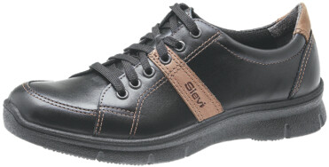 Eleganter, schmal geschnittener Halbschuh für Herren. Das weiche glänzende Kalbsleder verleiht dem Schuh eine exklusive Optik. Die ganzflächige Einlegesohle Sievi Comfort erhöht den Tragekomfort und die elastische FlexStep®-Sohle trägt zu einer Verringerung der Belastung von Füßen und Stützapparat bei. Metallfrei und ESD-zugelassen.