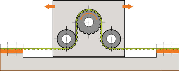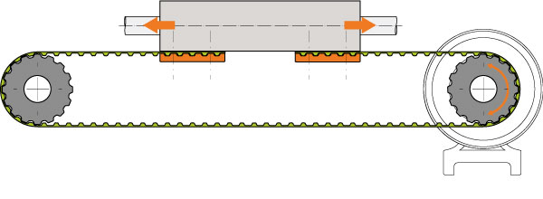 Bei dieser Bauweise wird der Linearschlitten über zwei Klemmplatten am Zahnriemen fixiert. Die nötige Vorspannung des Zahnriemens wird durch das Verstellen einer Achse oder das Verschieben einer der Klemmplatten eingestellt. Da in diesem System keine Rückenrollen verwendet werden, entfällt die wechselnde Biegelast auf den Riemen. Im Betrieb muss im Wesentlichen nur der Schlitten zusammen mit der Nutzlast beschleunigt werden. Die Zahnriemenenden werden vorzugsweise mit Klemmplatten am Schlitten befestigt, was eine zuverlässige Klemmung der Zahnriemen bis zu ihrer Bruchgrenze sicherstellt.