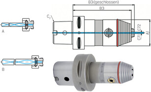 B: Dichtscheibe WTE 13 4,2 mm im Bohrfutterkopf eingebaut. Für Kühlkanalbohrer 6-13 mm, mit glatten Schaft nach DIN 6535 Form HA.